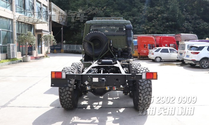 EQ2102NJ底盤是EQ2102GJ的高配版,擁有雙排駕駛室,可乘坐5人。備胎安裝在駕駛室后方,車輛帶有輪胎充放氣系統(tǒng)、雙油箱、頂置空調(diào)、牽引系統(tǒng)、冷啟動系統(tǒng)。