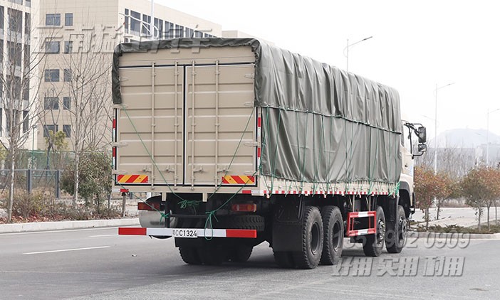 東風前四后八倉欄車,用于運輸牛羊畜牧、鮮果蔬菜、木材家具、也可加裝雙層舍棚用來運輸家禽。為方便長期在越野道路行駛,該車配備了拖車鉤、絞盤、剎車降溫水箱、行李架。