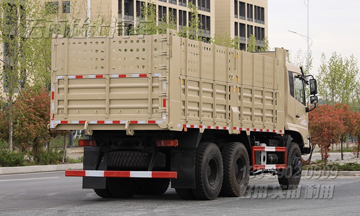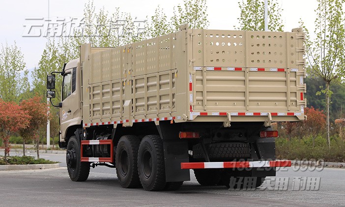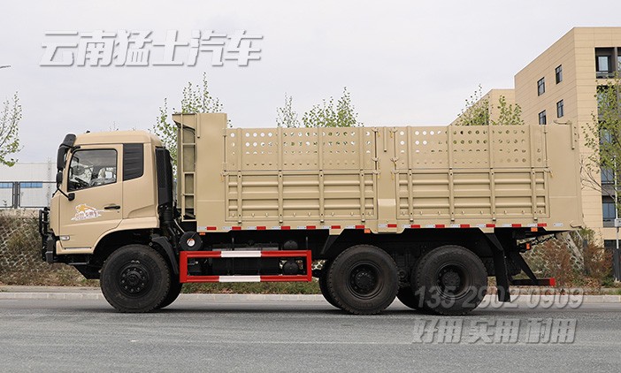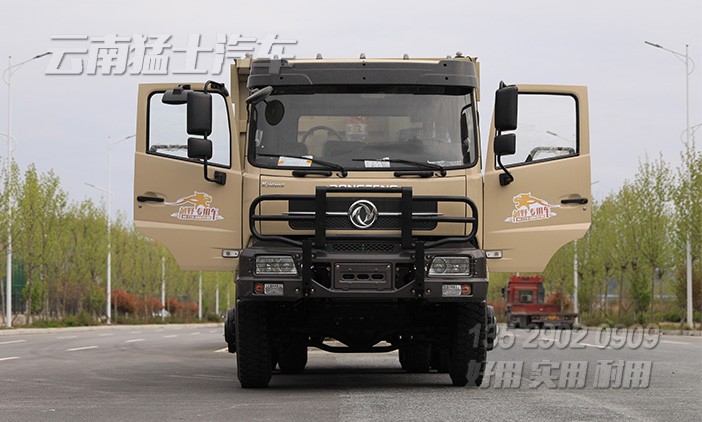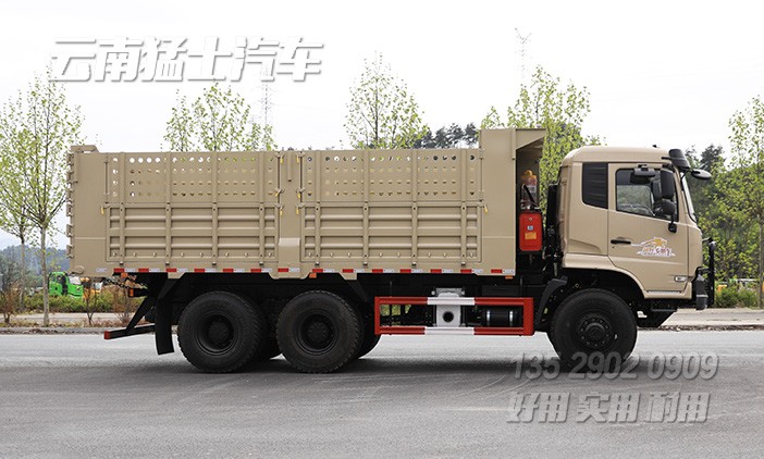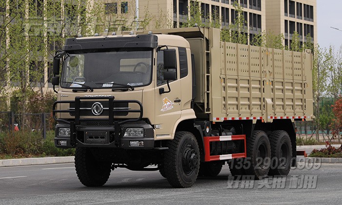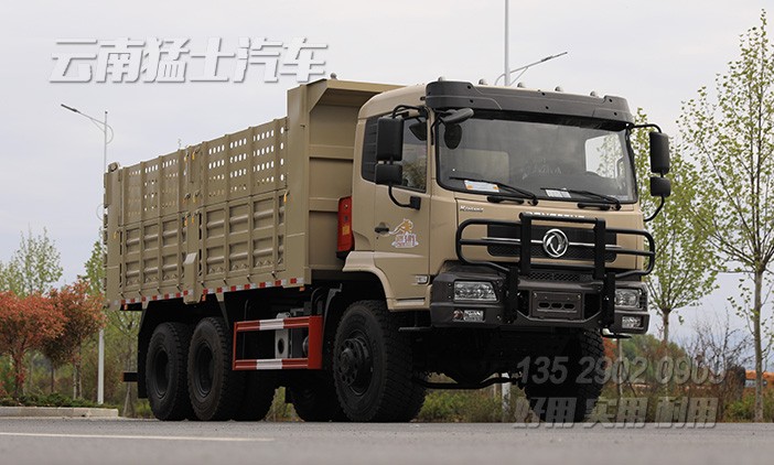 東風六驅25噸越野自卸卡車,采用260馬力發動機,分時全驅,舉升油缸前置,貨箱欄板加高。適合林區運輸木材,工地運輸砂土,礦區運輸礦石。