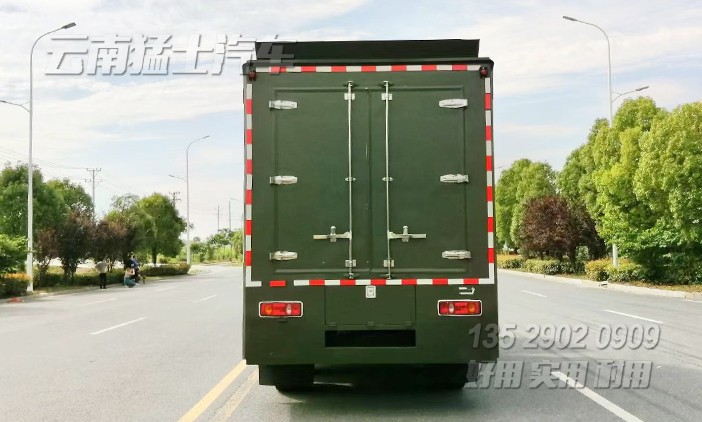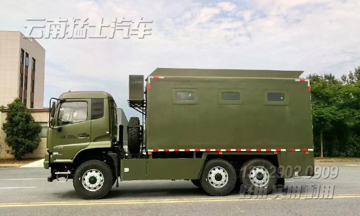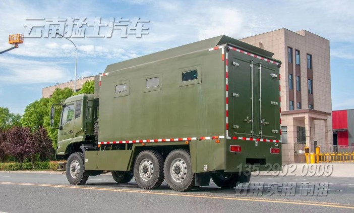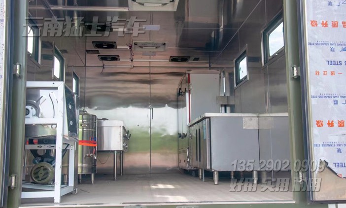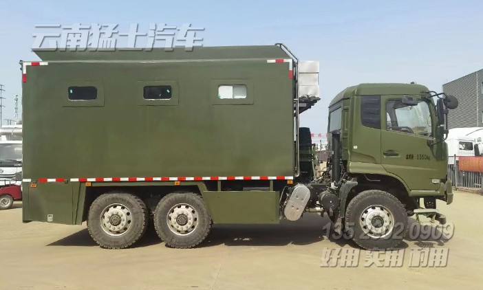 東風(fēng)自行式戶外炊事車,該車配備190馬力發(fā)動機(jī),六輪驅(qū)動,可在惡劣路況下形式,主要針對戶外露營、野外訓(xùn)練中就餐使用,最多可容納200人就餐。