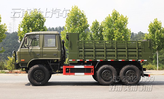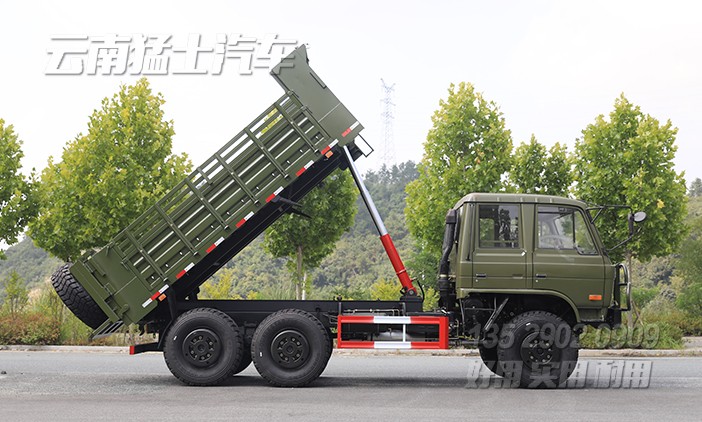 EQ2102雙排越野自卸汽車采用東風經典車型EQ2102作為底盤,該底盤有著優秀的越野性能,在山路、森林、沼澤、沙漠、雪域中有著良好的通過性。改裝成自卸后,將備胎移動到貨箱后方,單獨設計備胎架,一方面可以增加貨箱容積,另一方面也方便前置舉升油缸的正常使用。