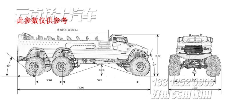 該款沙漠車采用露天結構,最多可容納24名乘客,后方采用電動折疊升降階梯,與尾艙門一體。420馬力超大動力發動機,1.6米高的沙漠專用輪胎,斧鍬鏟錘及脫困板等專用工具,可以應對沙漠中的惡劣路況。車上配有可拆卸的安全防翻滾支架,在風沙大的天氣下,可以套上專用的篷布,讓乘客免受風沙的襲擊,還可以觀賞浩瀚的沙漠景觀。