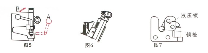 沿(圖5)箭頭方向扳動(dòng)手柄,使油缸上棘爪脫落卡槽(圖6),按住電動(dòng)舉升開關(guān),或?qū)u桿A和搖桿B連在一起后插入搖臂中,上下?lián)u動(dòng)搖桿下落到位,確認(rèn)液壓鎖處于(圖7)鎖止?fàn)顟B(tài)。保持手柄在A位置。