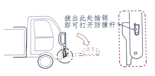 警告:駕駛室翻轉(zhuǎn)前,必須先打開駕駛室前防撞杠,否則會(huì)嚴(yán)重?fù)p壞駕駛室