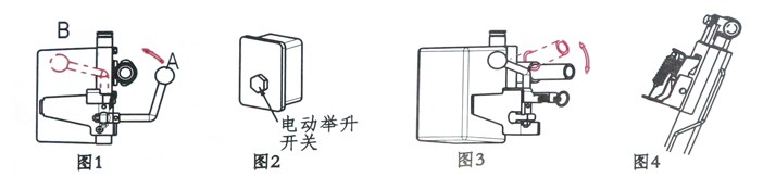 沿(圖1)箭頭方向扳動(dòng)手柄,按住電動(dòng)舉升開關(guān)(圖2),或?qū)u桿A和搖桿B(總隨車工具箱中取出)連在一起后插入搖臂中,上下?lián)u動(dòng)搖桿(圖3),升起駕駛室,確認(rèn)油缸上棘爪卡入卡槽中(圖4)