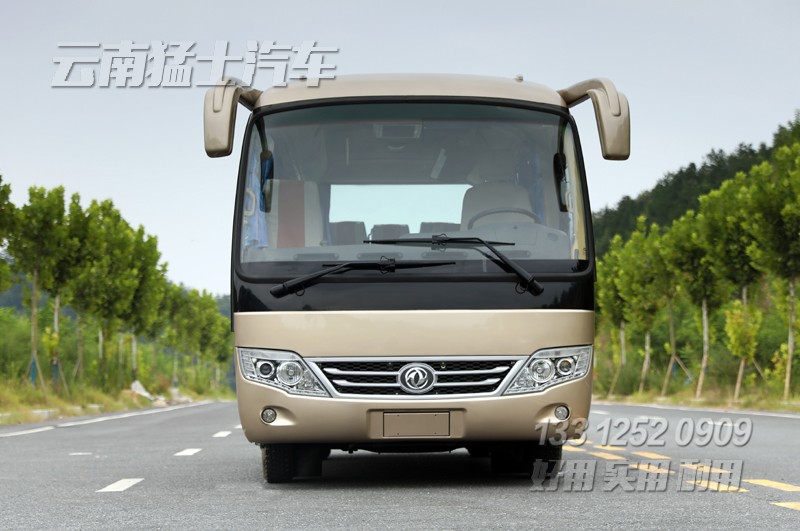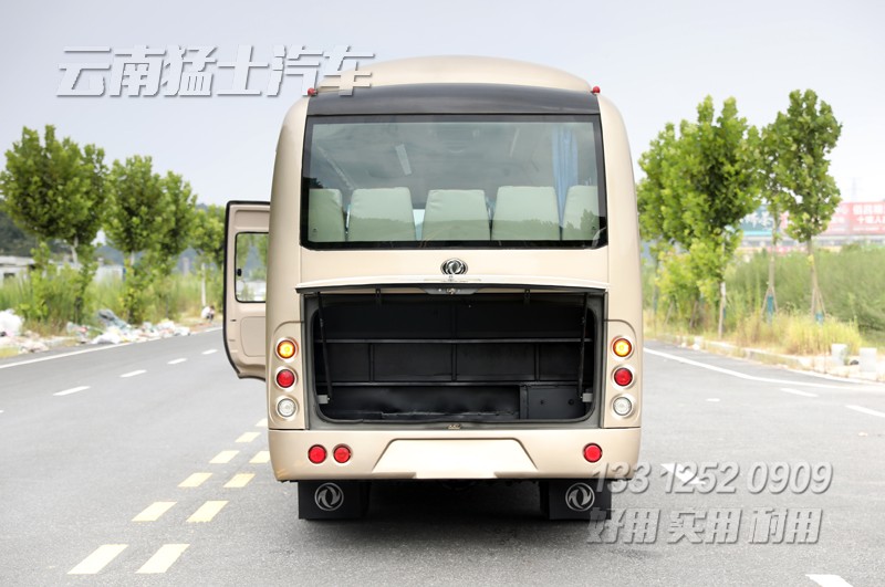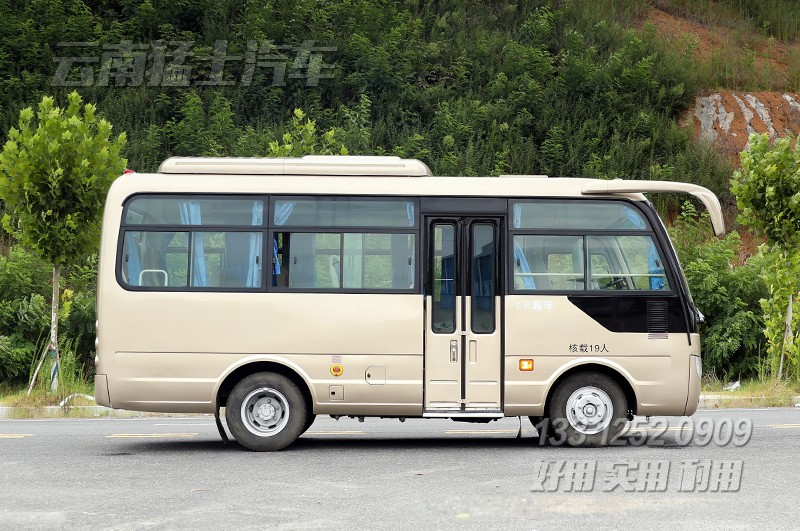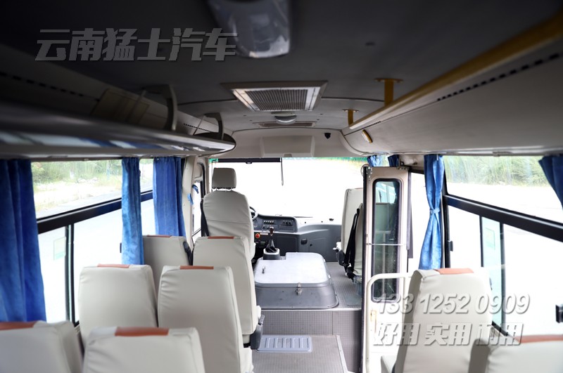 我公司這款中型鄉村巴士長5.9m寬2.3m高3m,尾部帶有一個行李艙。車門采用氣動液壓折疊形式,三級踏步方便乘客上車,為方便夜間乘車,在踏步上特意加裝有上車燈,踏步旁裝有上車扶手。車門內外均安裝有應急開關。乘客區內高1.9米,車頂左右分別安裝有公交車扶手和行李架,以及亞麻空調風道。車內共裝有19個座位(17個乘客座,主副駕駛座各一個),乘客座位采用真皮材質,配三點式安全帶,可安裝折疊扶手,駕駛員座椅采用減震座,車窗安裝有窗簾和安全錘,極大的提升了乘客和駕駛員的舒適感。前方引擎蓋上方安裝由應急逃生天窗,在發生事故時可以分擔車門的人流量。