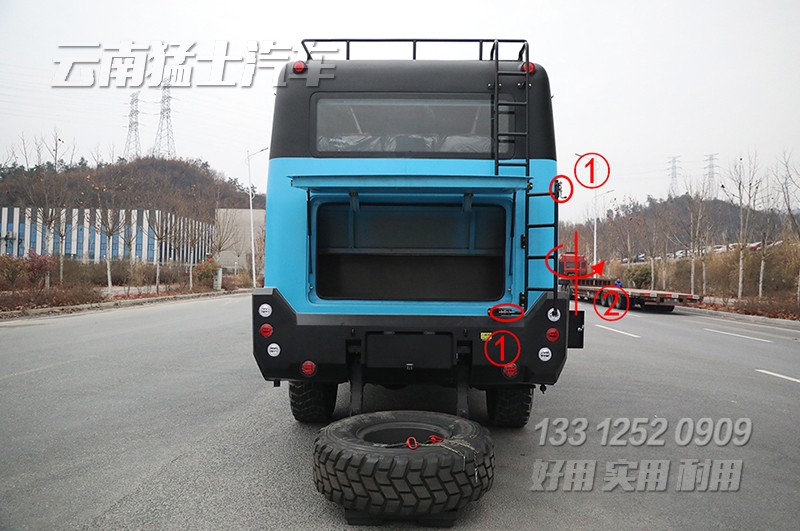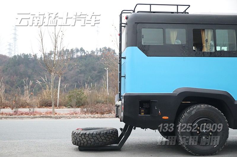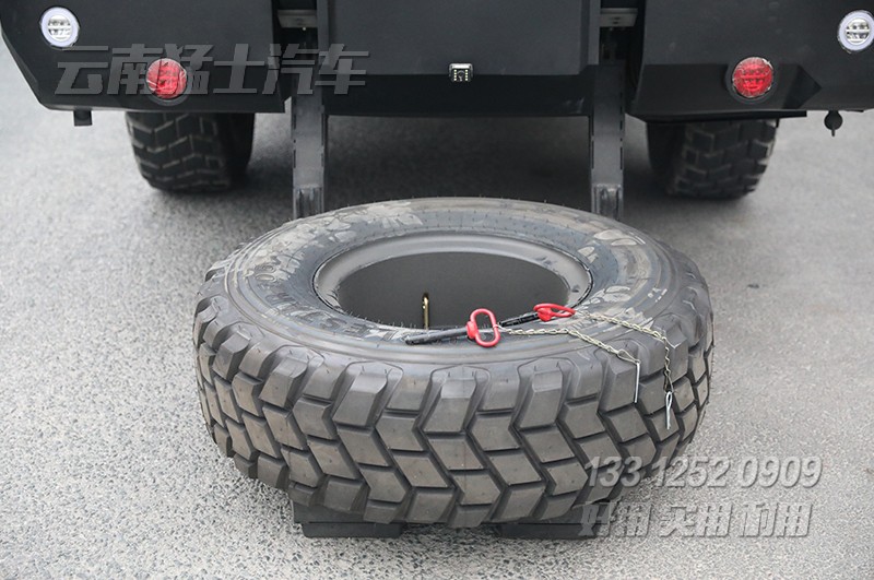 ? ? ? 作為一款可在惡劣路段下行駛的六驅越野客車,強大的越野性能靠的是多種強力配置的組合,其中輪胎也至關重要。該車采用12.5R20越野鋼絲輪胎,該輪胎比常規的輪胎相比要大,這樣可以一定程度上增大車輛的最小離地間隙和接近角離去角,同時內部含有鋼絲,讓該輪胎的使用壽命和耐磨程度得到提升,不過相應的也更重。在行駛過程中如輪胎發生故障需要更換,將變得不方便,所以我公司為該車設計了專用備胎架,方便備胎的裝卸。