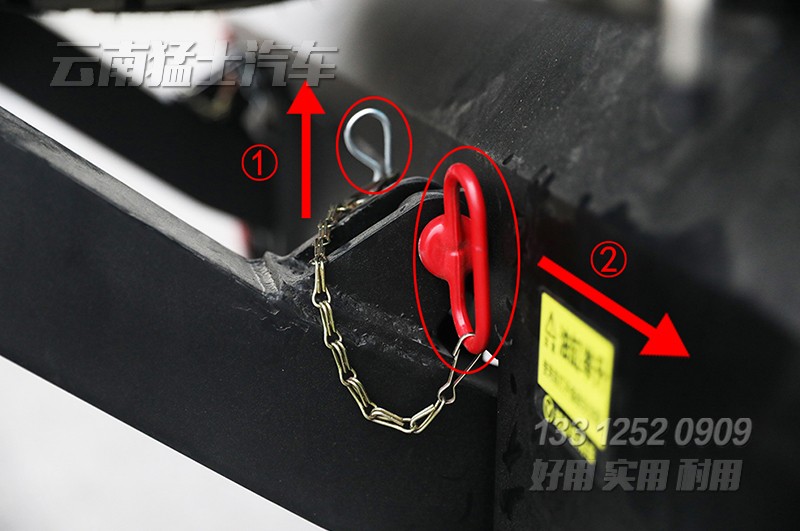 1.先將圖中①②部位的安全銷拔出(備胎架左右支點各有一組)。