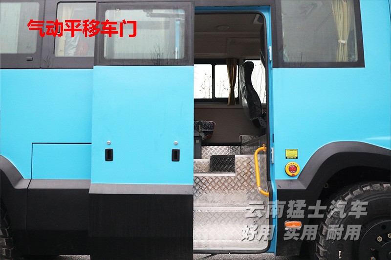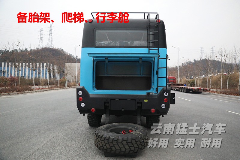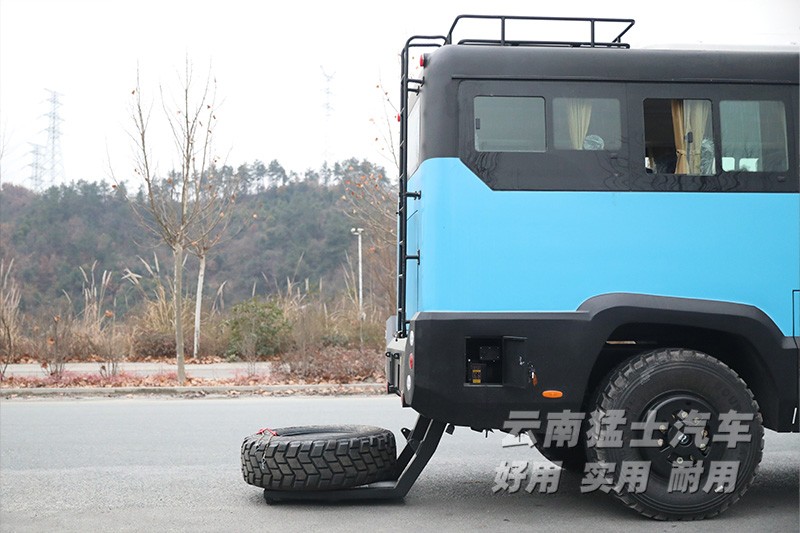 ? ? 該車長7.36米,可容納21名乘客,并有著足夠的行李存放空間,考慮到會在越野路段下行駛,不僅在動力和承載上留有余量,還在車前裝備了防護欄、燈網、底盤防護裝置。剎車將溫水箱可以在長期行駛時為輪轂降溫,同時也能確保平時的用水。車后方的備胎架也是該車的一大特色,笨重的越野胎在發生破損時難以拆卸,該備胎架采用液壓升降機構,極大的方便了駕駛員在野外故障時更換輪胎,在使用前記得先抽掉備胎架上的兩個安全銷。車尾的爬梯可通向車頂的行李架,適合安放大面積的貨物。車門采用氣動液壓平移開啟,在狹窄區域更便捷。
