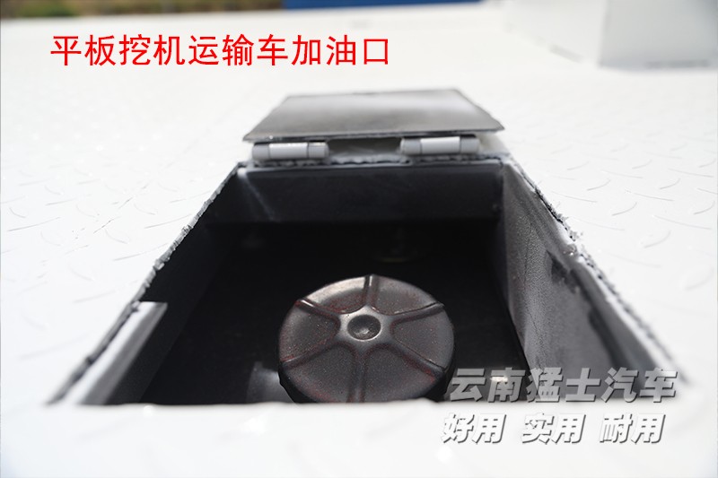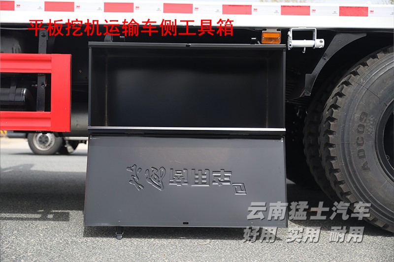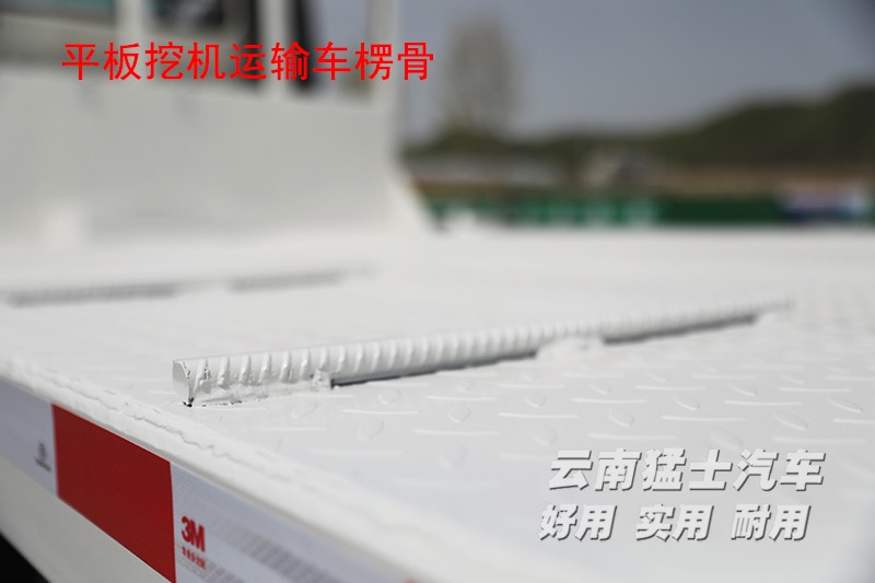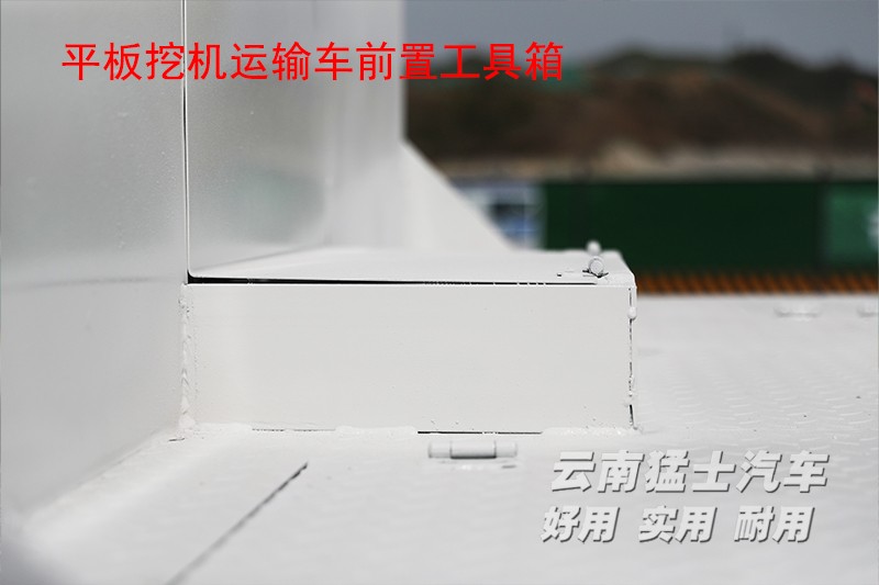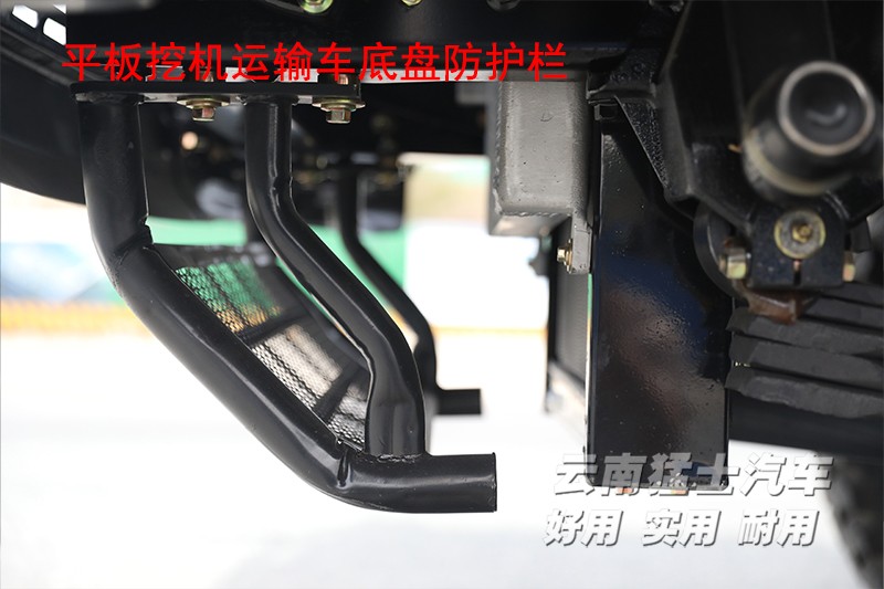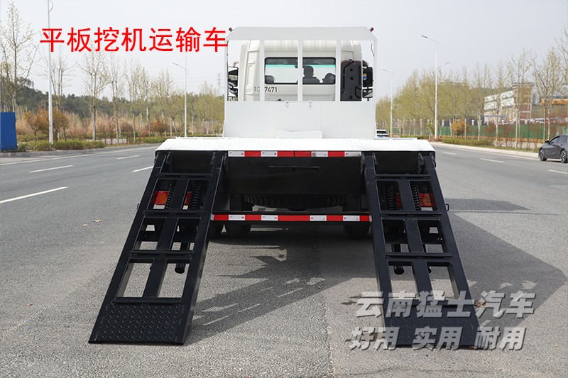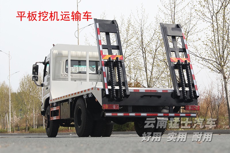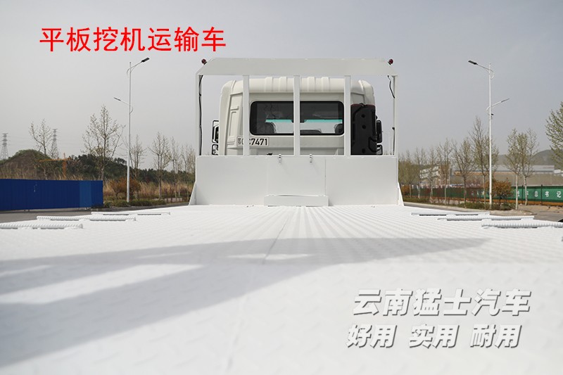 平板挖機車顧名思義是平板車的一種,不同之處在于該車可以運輸挖掘機。與普通的平板車相比,后方多了一副爬梯,車輛在行駛時爬梯是處于收起狀態,需要使用時要手動放下,爬梯上帶有液壓裝置,可以起到緩沖作用,后方的支腿也需要支撐在地面減緩受力。這款平板運輸車,平板長5.4米,寬2.4米,在使用前需要將車輛停放在平坦路面,先將尾部支腿放下,然后爬梯鎖銷打開,操作人員站在平板上將爬梯放下。挖掘機可以順著爬梯開到平板上。平板采用花紋板材質,在挖掘機停放區域還設有楞骨,這些都可以讓挖掘機停在上方更平穩。平板下方和前方各設有一處工具箱,可以存放捆綁帶、枕木等工具。平板的兩側設由多個緊繩器,在停放挖掘機時,需要使用緊繩器和捆綁帶,將挖掘機的車輪進行固定。固定完成后收回爬梯和支腿,并將爬梯鎖銷重新擰上,就可以正常運輸了。考慮到挖掘機通常在路況惡劣的工地上使用,地面崎嶇容易刮傷底盤,所以在車輛前方設置有底盤防護欄。
