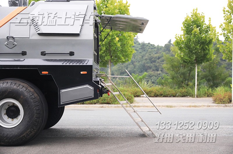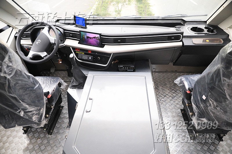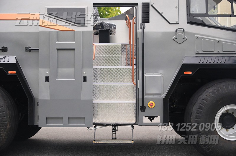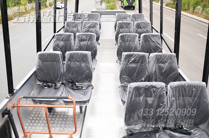 車輛主副駕采用的是減震座椅,乘客區(qū)標(biāo)配18個(gè)皮革座椅(沙漠地區(qū)皮革材質(zhì)方便清潔),座椅安裝安全帶,背部帶有扶手,第一排乘客座椅前安裝有鐵質(zhì)扶手。考慮到沙漠地區(qū)鞋子容易進(jìn)沙,游客多帶有鞋套,而且小沙粒多,容易打滑,底板采用鋁制花紋板;拐角處封邊壓實(shí),避免劃傷乘客。車輛頂部帶有防翻滾支架,隨車配有透明篷布,為游客增加了一層安全保障(建議車速不要超過(guò)30km/h)。駕駛區(qū)配有360°倒車影像,音響,喊話裝置。車門采用了平移式開(kāi)啟方式,在狹窄空間下也能打開(kāi)。