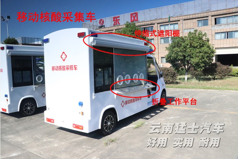 該車是一款電動(dòng)車,體積小巧,駕駛方便,可以臨時(shí)停放在任何平坦路面進(jìn)行核酸采集,隨停隨走。艙內(nèi)封閉的空間不會(huì)受天氣影響而無法工作,同時(shí)可安裝空調(diào),讓核酸采集員更加舒適的工作。艙內(nèi)長2450mm寬1350mm高1850mm,足夠容納2名工作人員同時(shí)對(duì)2組居民開展核酸收集,內(nèi)置消毒燈,有效殺死艙內(nèi)細(xì)菌病毒,同時(shí)艙內(nèi)還有足夠的空間存放各類防疫物資。車上裝有伸縮式遮陽棚,可以為正在采集核酸的居民遮風(fēng)擋雨。可折疊的工作臺(tái)、對(duì)講機(jī)等都是為了居民著想而設(shè)計(jì)的。完全密封的醫(yī)用采樣手套,讓醫(yī)生與居民0接觸進(jìn)行采樣,避免交叉?zhèn)魅荆WC防疫人員的健康。