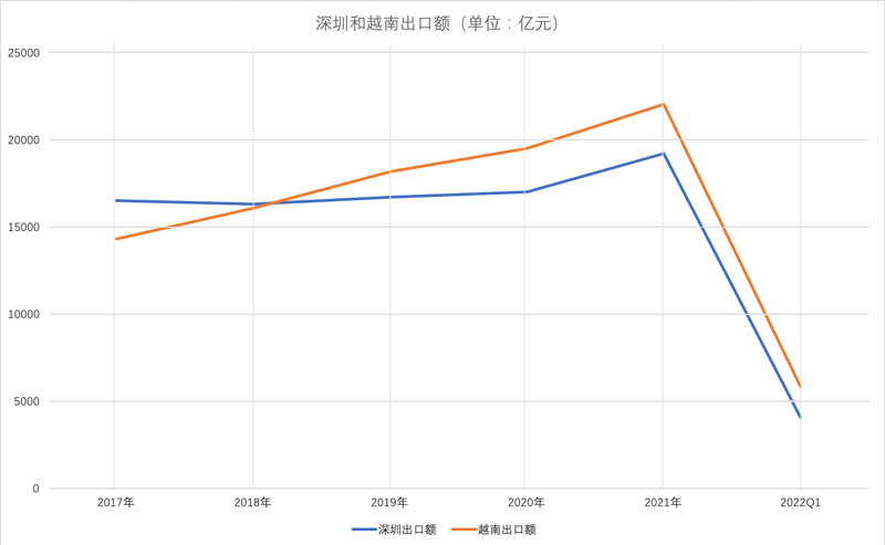 根據越南海關總署公布的數據,越南3月份出口額為347.1億美元(約合2272億元人民幣),同比增長14.8%;而深圳海關的數據顯示,3月份深圳出口貿易額約為1200億元,同比下降14%。